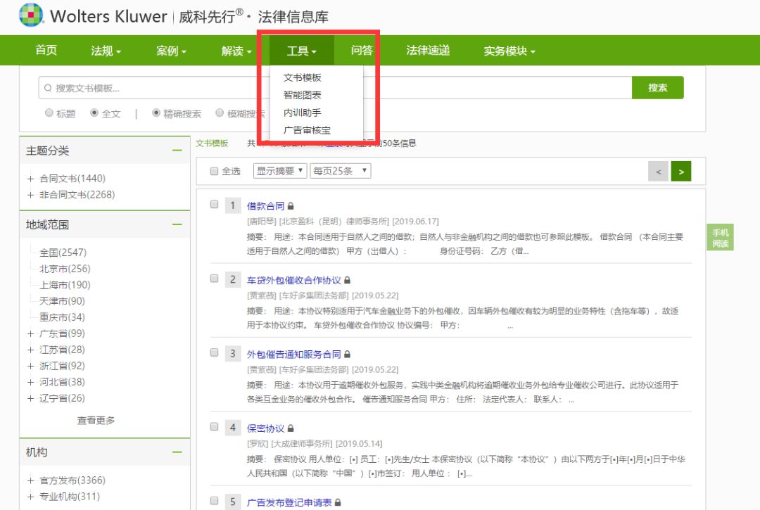 (2)威科先行的工具版块——这个版块里分成文书模板、智能图表、内训助手几个工具集成,主要面向人力资源和财税,分类比较细,但是容量不是很多。