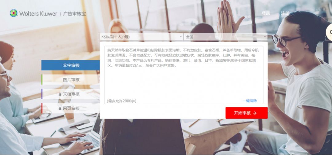 (3)威科先行的广告审核宝——是一个智能化文案审核工具,用户只需在线上传文案或输入网址,一键点击,即可获取相应的合规风险提示报告,比较适合公司法务人员使用。