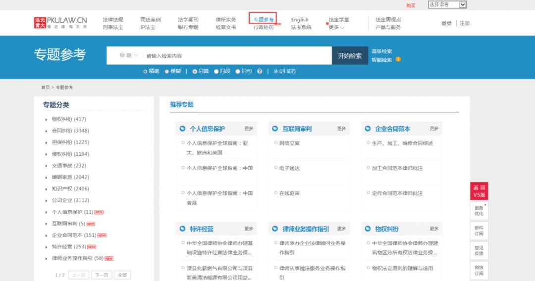 (2)北大法宝的“专题参考”版块——从律师实务角度梳理了20多个专题,在每个专题下收集了相关实务文章和操作指引,专题数量要比威科先行多,但是每个专题内收集的篇幅数量偏少。