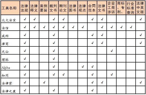 这里将常用的综合型的法律检索工具包含的内容版块罗列成表以供大家参考——