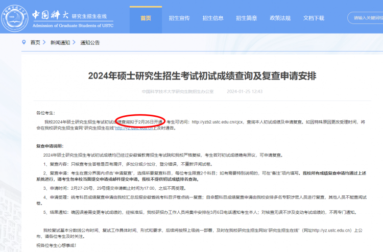 中科大近日发布了成绩查询及复核通知,通知中提到:“成绩查询拟于2月26日开通”。