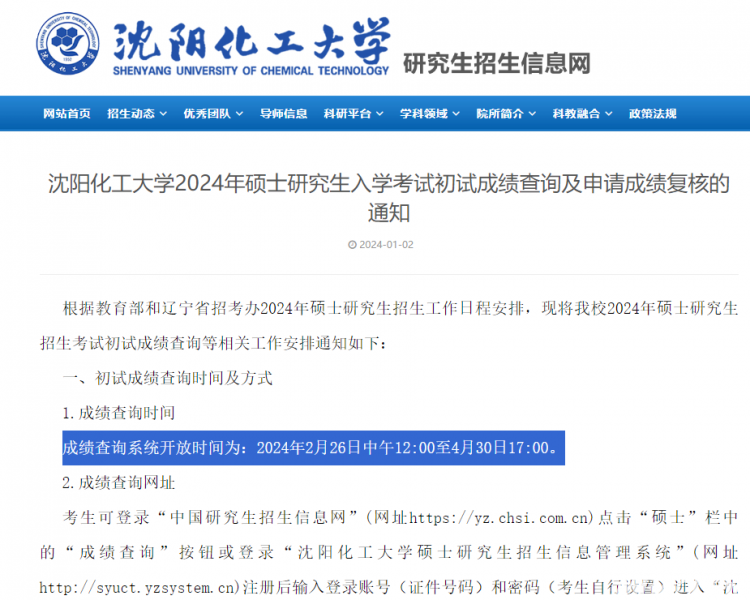 沈阳化工大学近日发布成绩查询及复核通知,提到——成绩查询系统开放时间为:2024年2月26日中午12:00至4月30日17:00。