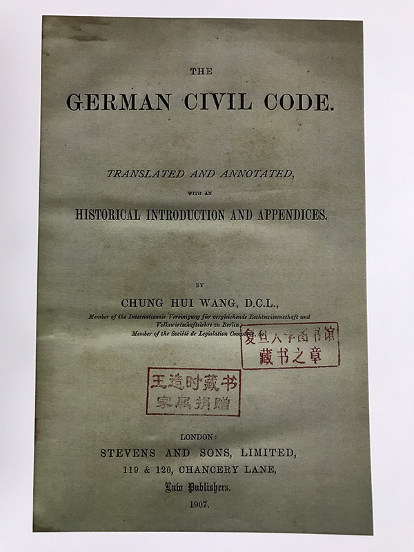 其中,复旦法科的先驱者和奠基人王宠惠的早期藏书尤为珍贵。1907年,王宠惠将德文版《德国民法典》翻译为英文,这是当时欧洲最早的《德国民法典》英译本之一。此译本一出版即博得世界法学界的广泛赞誉,成为英美各大学法律学院指定的必读课本。本次展览就有他的这部代表作。这本书原为复旦大学历史系已故学者王造时收藏,后由家属捐赠于复旦大学历史系资料室,直到展览前一天才“火速”加入。