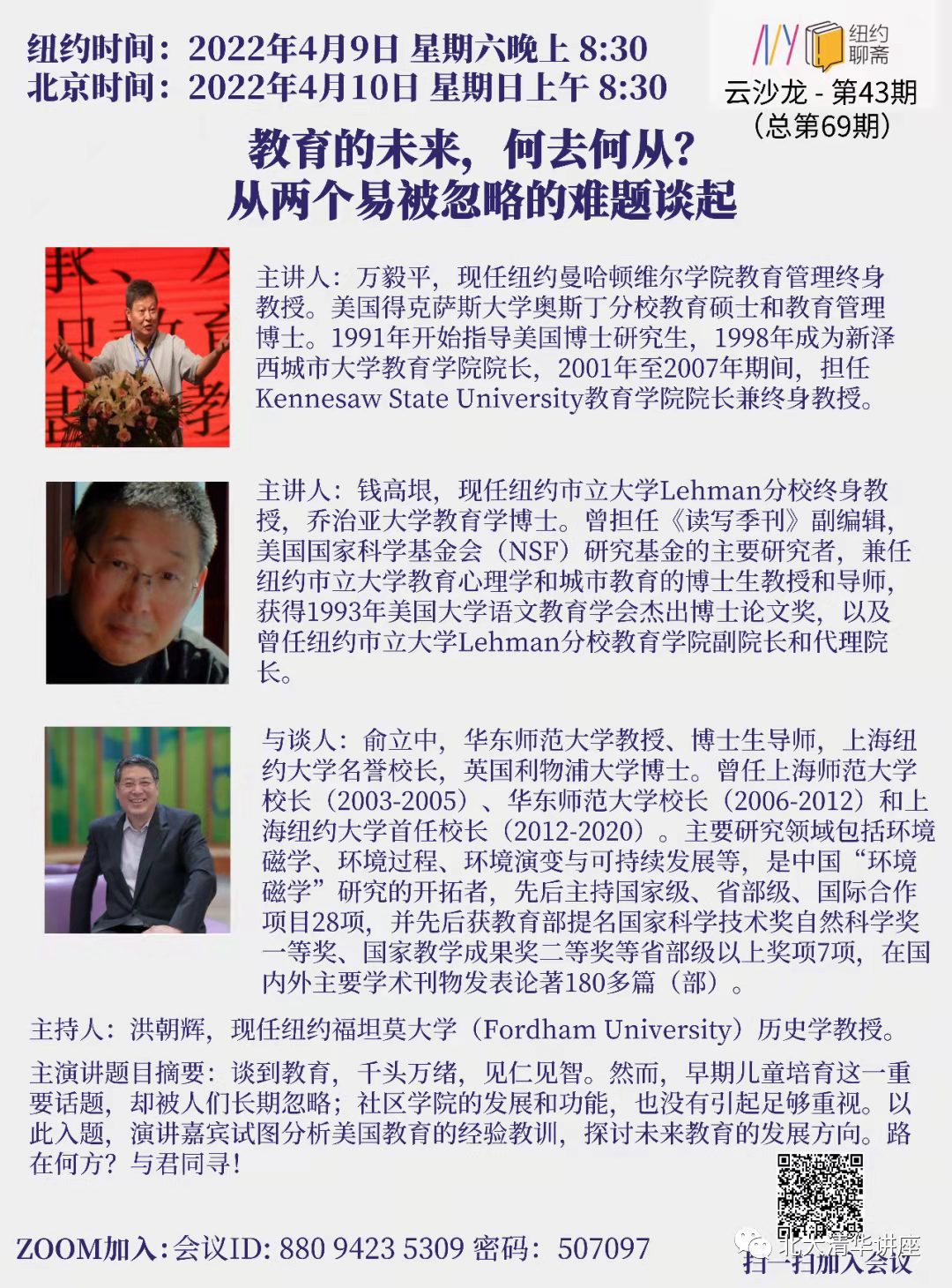 主讲人:万毅平(纽约曼哈顿维尔学院教育管理终身教授)、钱高垠(纽约市立大学Lehman分校终身教授)