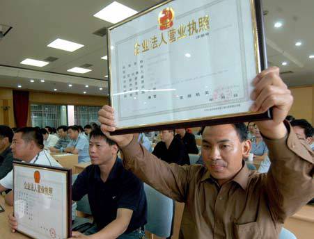 浙江省人大常委会率先出台浙江省农民专业合作社条例,首次明确了农民专业合作社生产经营的法律地位,促进了农民专业合作社的健康发展。图为2005年5月9日,浙江省台州市仙居县农民姚军(右)在杭州展示我国第一张农民专业合作社企业法人营业执照 摄影/王定昶