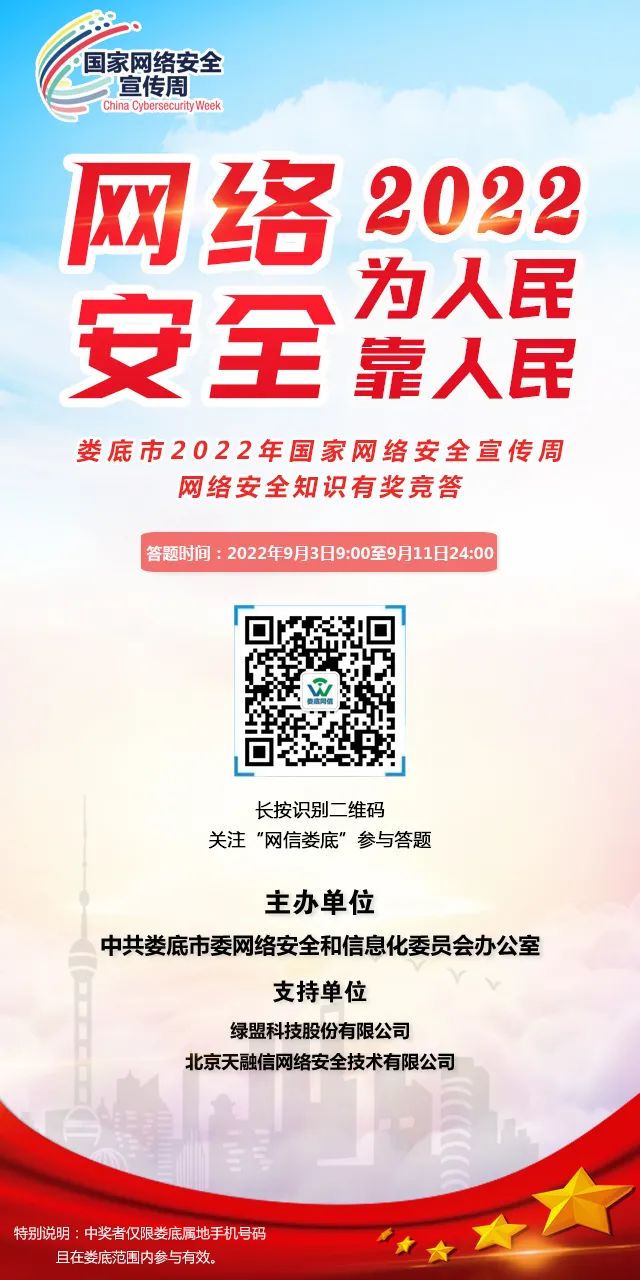 为深入开展网络安全宣传教育,扎实开展2022年国家网络安全宣传周活动,普及网络安全知识,提升全社会网络安全意识和防护技能,全面营造全社会共筑网络安全防线的浓厚氛围,娄底市委网信办拟在全市范围内开展网络安全线上有奖答题活动。