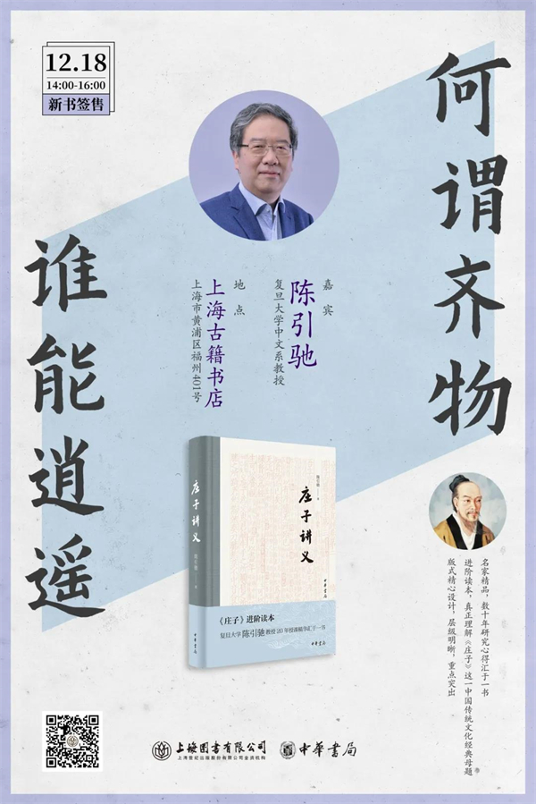 谈及庄子,人们可能马上就会联想到“逍遥”与“齐物”,它们既构成了《庄子》开头两篇的篇名,也代表着庄子的重要观点、理念。而两者究竟谓何,其中孰轻孰重,这些都值得我们多做一些思考。12月18日,复旦大学中文系教授、博士生导师陈引驰将在上海古籍书店举办“何谓齐物?谁能逍遥?”主题讲座。讲座中,陈教授将结合庄子思想的系统和脉络,对“逍遥”“齐物”做出解读,带领读者走近庄子其人其书。