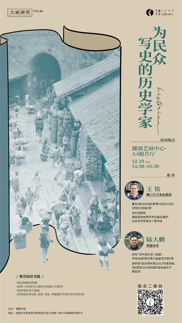 “要为民众写史。我们的日常生活,我们的芸芸众生,我们的大众也应该是历史研究的对象。只有英雄帝王和精英的历史,这绝对不是历史的全部。”历史学家王笛,这么说的,也是这么做的。他的多部历史著作,既是严谨的学术著作,也被广大读者所喜爱。12月19日,王笛教授、青年译者陆大鹏做客寻麓,从公共生活与微观视角出发,与读者一同分享历史学家如何为大众写作这个话题。