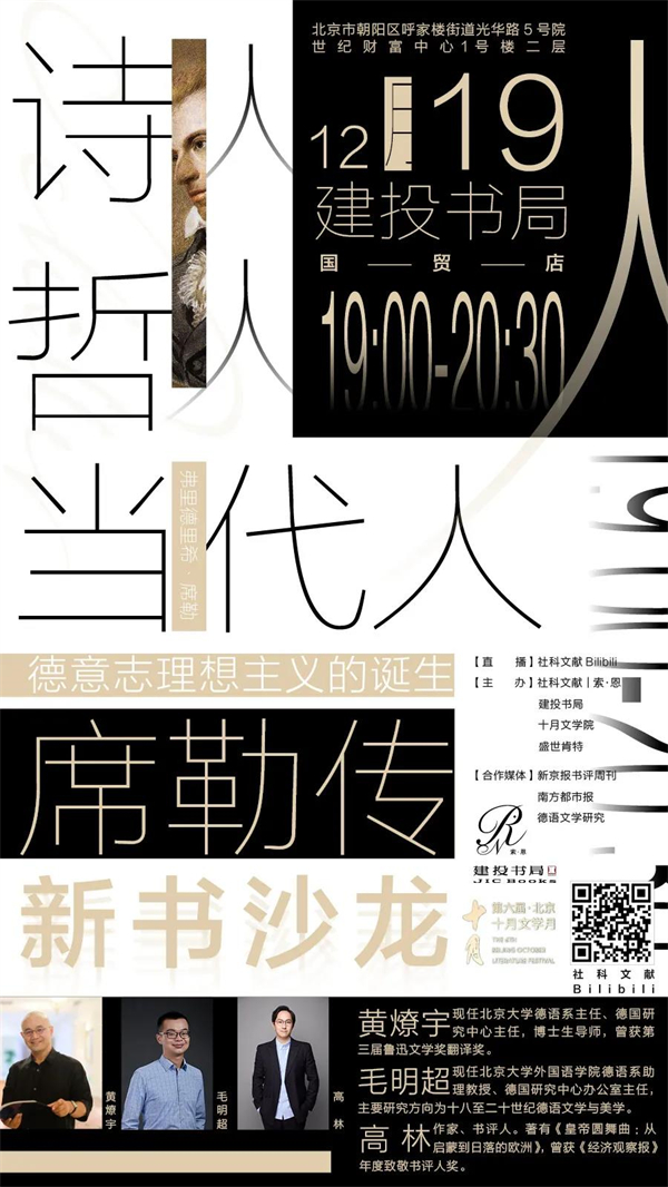 阅读席勒在今天还有任何意义与价值吗?席勒和歌德所代表的魏玛古典文学,难道不是也与他们所向往的古希腊罗马一样,早已是昨日的世界了吗?还是说,正是最不受物质之累的文字,才是最能够抵御历史冲刷的介质?抑或是那些他曾在文学中探索的问题反复重复,以至于只有超越时间的艺术才能回答超越时间的困惑?或许这就是经典的标志:需常读,常为新。或许这也是席勒的魅力:他不为任何一个时代写作,却成了每一个时代的当代人。12月19日,社科文献索·恩邀请北京大学德语系主任、德国研究中心主任、博士生导师黄燎宇,《德意志理想主义的诞生:席勒传》译者、北京大学外国语学院德语系助理教授、德国研究中心办公室主任毛明超,以及作家、书评人高林,围绕以上问题作探讨。