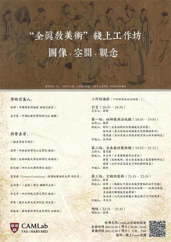 全真教是金代以后兴起于中国北方的新兴道教流派,元代以后逐渐壮大,成为中国道教的一支主流,更因金庸小说对其历史的借用而广为华语世界所知。近年随着中国美术史研究的不断细化,一批探讨全真教艺术的中文专著涌现于学界,但尚无专题研讨会,本次工作坊聚集了这些著作的大部分青年作者,以提供互相交流的平台,促进对于全真教视觉与物质文化的研究。