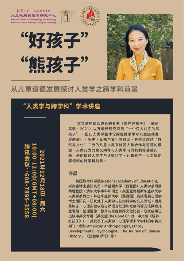 本次讲座结合讲者的专著《培养好孩子》以及最新研究项目“一个汉人村庄的熊孩子”,回归人类学整体论的视野来思考儿童道德发展的演化、历史、认知与文化等意涵,并透过超越“自然与文化”二分的儿童世界来检视人类合作与道德的根源、人类行为的意义阐释与人类学习的机制等基础问题,进而探讨人类学与认知科学、计算科学、人工智能等领域的跨学科前景。