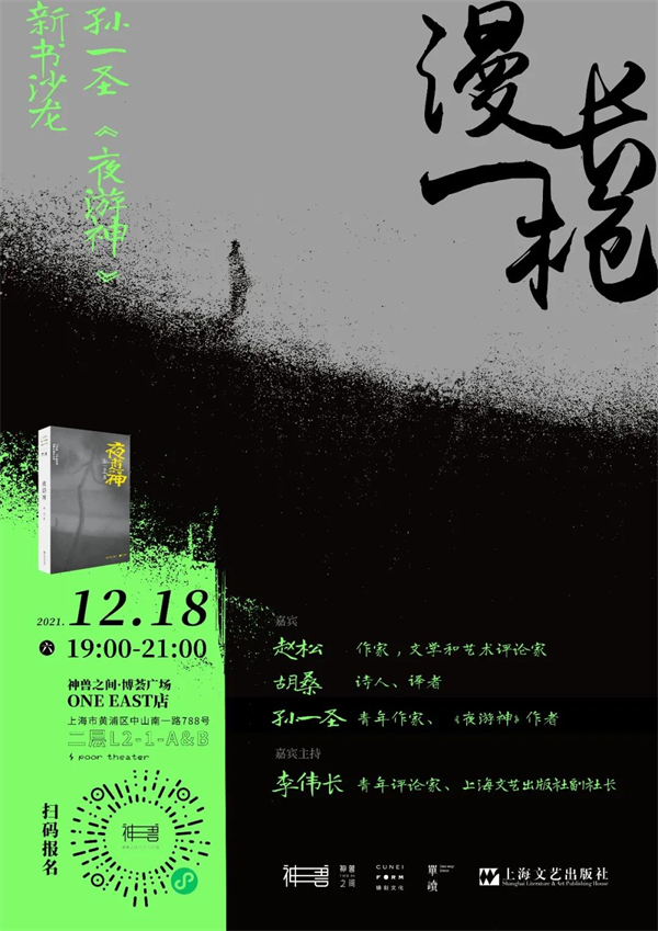 《夜游神》被人称为“风格崛起之作”,也被认为是孙一圣走向成熟的标志。与五年前出版的、引发颇多争议的处女作相比,孙一圣在这部《夜游神》里,形成了怎样的风格?所谓的成熟,又体现在哪里?本周六晚,作家赵松、诗人胡桑、评论家李伟长,将与孙一圣来到神兽之间,聊聊他这五年来的写作历程,看这“漫长一枪”如何打响。