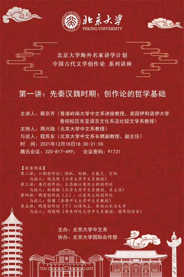 蔡宗齐是著名海外汉学家,研究领域涉及中国古典诗歌、古代文论、比较诗学、比较文学、比较哲学及佛教等。本次,蔡宗齐教授将在北京大学中文系举办系列讲座,第一讲他将为我们主讲先秦汉魏时期创作论的哲学基础,并与北京大学中文系长聘副教授、副主任程苏东进行对谈。