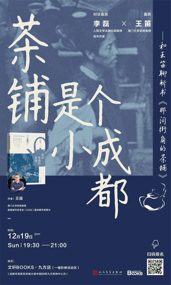 成都人的生活方式促进了茶铺繁荣不衰。跟随王笛的新书,我们将会在茶铺历史文化中知道:什么是茶客们的文化自信。12月19日,我们邀请到澳门大学讲座教授、美国城市史学会(UHA)最佳著作奖得主——王笛带着他的著作《那间街角的茶铺》,空降文轩BOOKS九方店,与我们一起“身在历史之中”,讲述成都人的生活史。