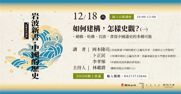 有关中国通史系列的代表性作品,先有15卷本《剑桥中国史》的出版,之后还有6卷本《哈佛中国史》、12卷本日本《讲谈社·中国的历史》。2020年,日本岩波书店出版五卷本《岩波新书·中国的历史》,首次打破编年史结构,而是以“中国何以为中国”的问题意识重新组织,以耳目一新的方式改写中国通史。本次线上讲座,我们特别邀请《岩波中国史》的主编及作者冈本隆司、《哈佛中国史》主编及作者卜正民、著名历史学者李孝悌一起,对谈中国通史的建构及诠释。