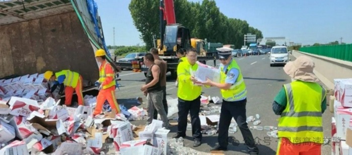 【货车爆胎侧翻 渭南高速交警快速救援】5月24日9时53分,高交大队阎禹中队接到报警称,京昆高速韩城方向K999处发生一起货车侧翻路面的道路交通事故,接警后,富平分队民警迅速赶赴现场处置。做好现场安全防护,封闭一二三车道,引导过往车辆从第四车道安全通行。据了解,货车驾驶人满载瓶装矿泉水从甘肃送往陕西澄城县,行至事发路段时,车辆右后轮突然爆胎,导致车辆失控侧翻。为最大程度减少群众损失,高速交警徒手将散落在车道上的矿泉水移到路边进行整理、归类。经过长达三个多小时的紧张救援,现场清理干净,货物安全转运,道路交通恢复正常。