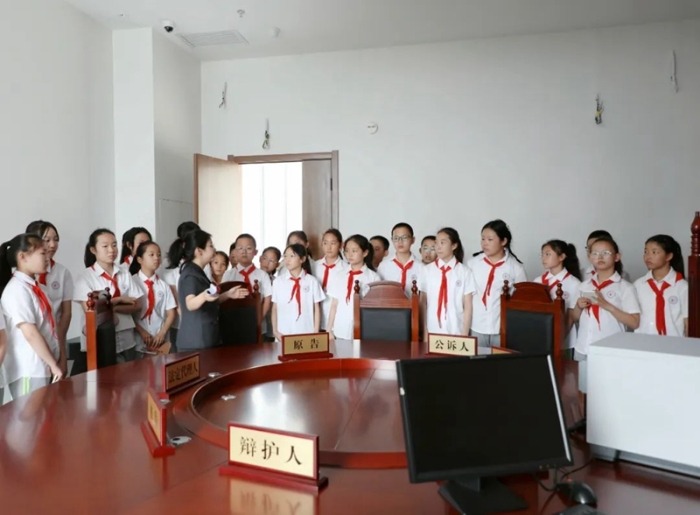 澄城法院干警带领小学生参观家事审判法庭。