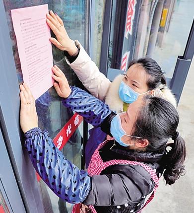 浙江长兴县林城镇司法所志愿者在张贴防疫普法宣传单。新华社发