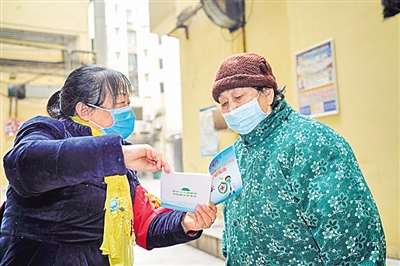 在重庆市北碚区天津路社区北京路8号散居楼院出入口,“楼院哨兵”志愿者黄远均(左)为居民讲解新冠肺炎疫情防控知识。新华社发
