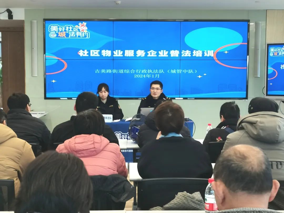 为进一步落实“谁执法谁普法”责任制,不断加强城管和社区的黏合度,强化物业服务企业的法治意识和管理水平,近日,闵行区古美路街道综合行政执法队(古美城管中队)开展了“城法有约 送法进物业”普法活动,辖区内71个小区的物业服务企业负责人参加培训。