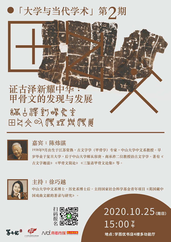 甲骨文最重要的应该是它的史料价值。它不仅仅是一个文明的符号、文化的标志,还印证了包括《史记》在内的一系列文献的真实性,把有文字记载的中华文明史向前推进了近5个世纪。那么,在当代,对于非研究者来说,认识、了解甲骨文还有哪些意义呢?它只能是极少数的那一批人的心系所在吗?本次,我们非常荣幸地邀请到上文提到的“四堂五老”之一商承祚先生的弟子、同样也是甲骨文研究领域领头人之一的陈炜湛教授,带领大家走向一场甲骨文之旅。