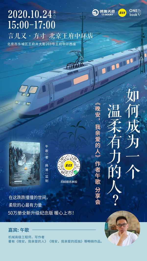 一本小人物也发光发热的心动故事集,带你重拾天高海阔的勇气,献给那些平凡人生里的不平凡的青春!10月24日,高级机械工程师、青年作家午歌将携新书《晚安,我亲爱的人》做客言几又·方寸北京王府中环店,分享自己创作背后“传奇又浪漫”的经历。他又是怎样一步步成为“一个温柔有力的人”?在深秋的北京,午歌将和大家做暖心分享。