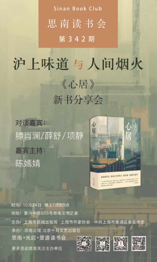 “房子是上海人绕不过去的话题。滋生出各种情绪,各种际遇。” 《心居》以房子为切入点,写的是上海,更是上海人。作者滕肖澜不疾不徐、细腻软糯的行文风格,正是“沪上味道”最地道的注脚——这座城市和城中人不失温热的精明、无害的野心,以及洇入人间烟火的妥帖。10月24日晚,著名作家、《心居》作者滕肖澜,著名作家薛舒,评论家项静,以及青年评论家陈嫣婧,做客思南文学之家,聊一聊上海这座城市以及小说中的味道……