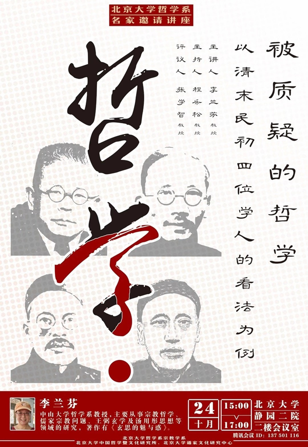 随着中国哲学学术的不断推进,原创性哲学思想和理论不断涌现,成为生成时代思想与中国文化话语的重要动力。北京大学哲学系宗教学系将邀请在哲学及宗教学界具有广泛影响力的学术名家分享他们的原创思想,以新问题、新材料、新视角拓展师生的学术视野。本场邀请中山大学哲学系李兰芬教授,以清末民初的四位学人的看法来谈谈哲学。