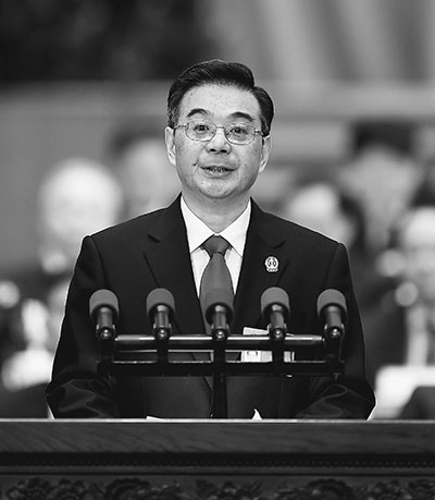 各位代表,以党的十八届四中全会召开为标志,依法治国开启了新征程。我们要在以习近平同志为总书记的党中央坚强领导下,高举中国特色社会主义伟大旗帜,以邓小平理论、“三个代表”重要思想、科学发展观为指导,深入学习贯彻习近平总书记系列重要讲话精神,忠实履行宪法法律赋予的职责,迎难而上,奋发有为,为协调推进“四个全面”、实现中华民族伟大复兴的中国梦作出新的更大贡献!