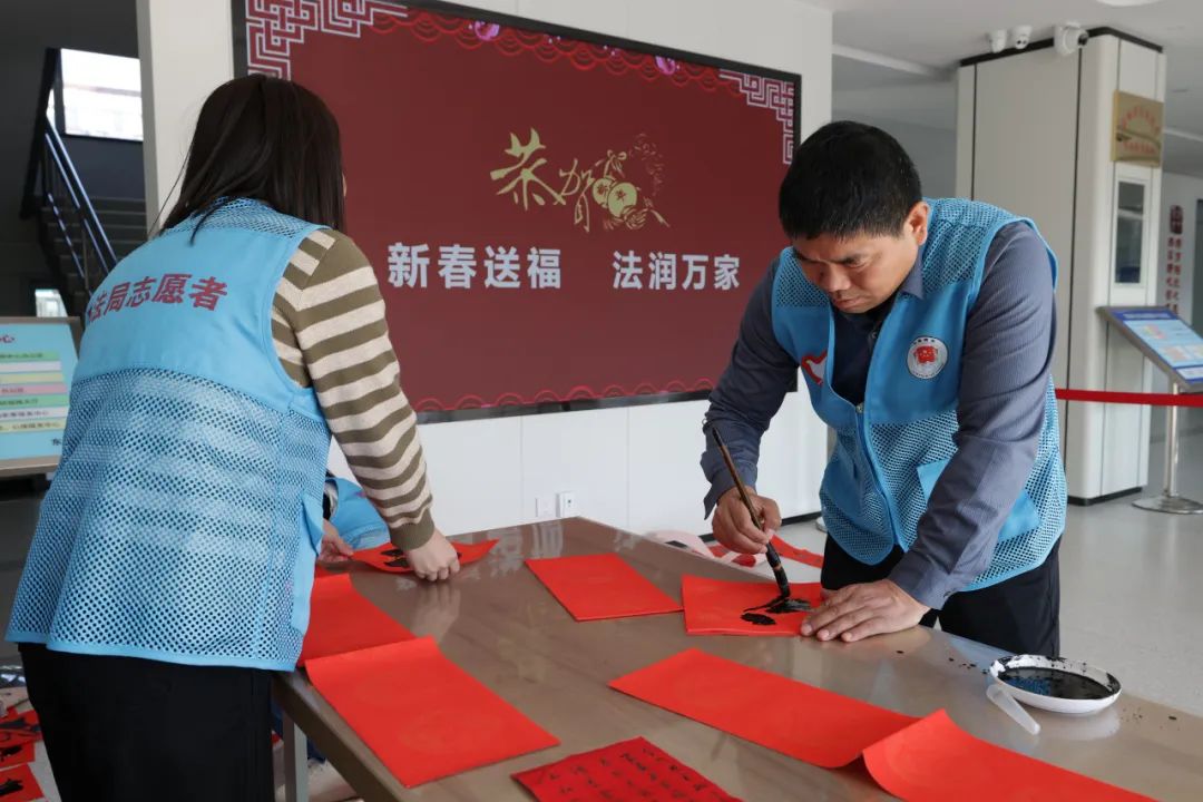 活动现场,志愿者们挥毫泼墨,将浓浓的新春祝福和对法治的美好向往凝聚在笔尖,写下了“法治声中春意闹 文明国里政风清”等法治春联。