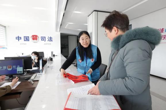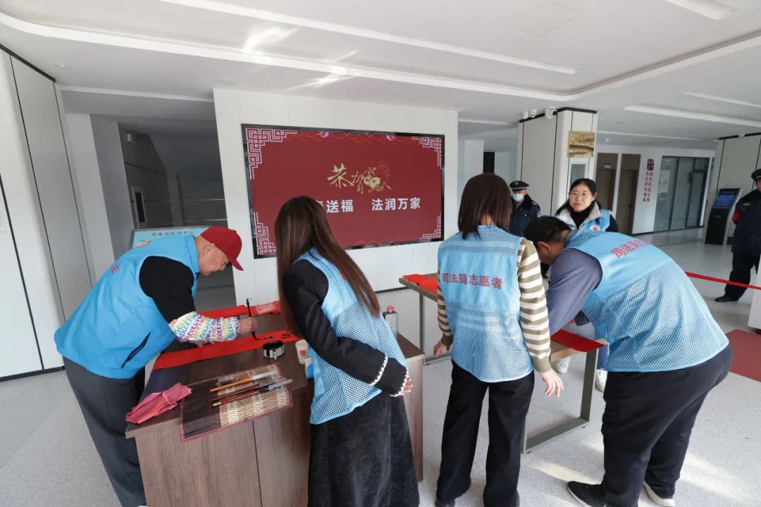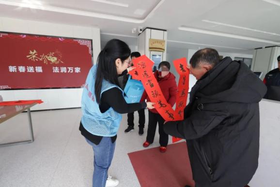在给群众送去新春祝福的同时,志愿者们现场发放了宪法、民法典、百姓法治宝典等宣传资料,并就群众关心的法律问题给予耐心细致地解答,真正为群众答疑解惑。前来办理业务的群众表示,“这个活动搞得好,送福字送春联,送“法”又送“福”,咱也过个红红火火的法治年。”