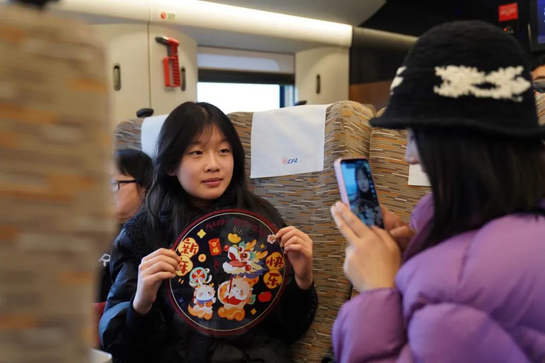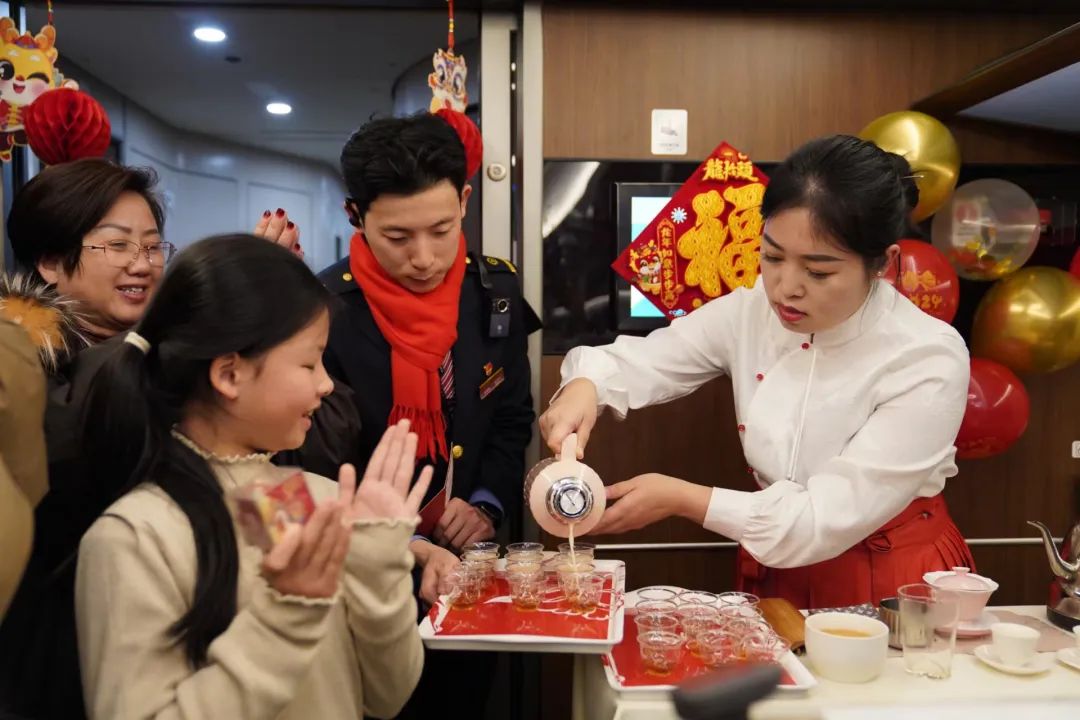 2月2日的G8751次列车上,成都客运段列车工作人员将一杯杯温热的茶水,一张张喜庆的“福”字送到旅客手中,传递着新年最诚挚的祝福。