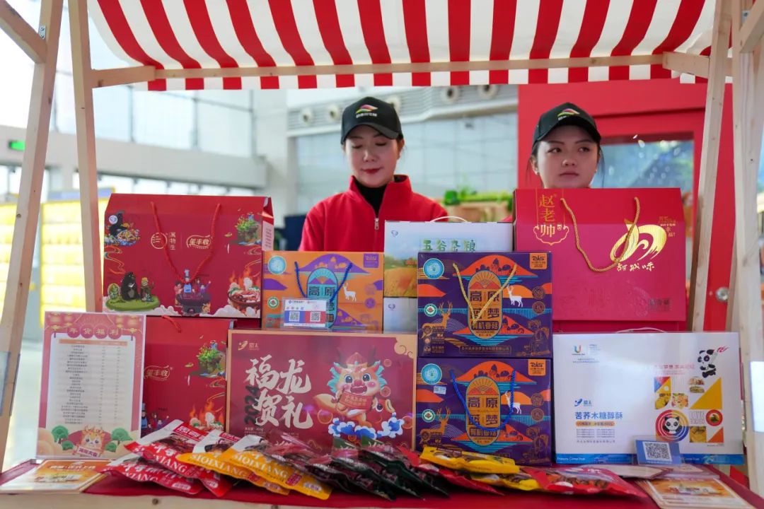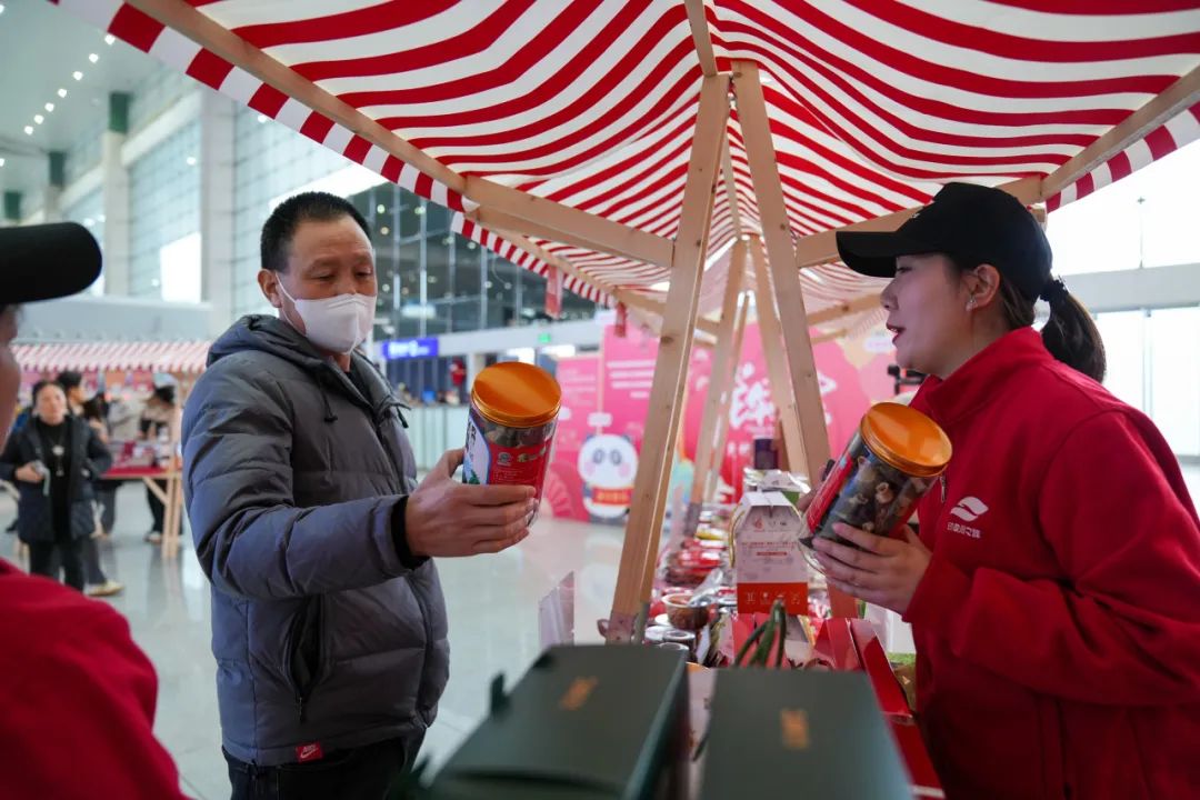 2月2日,首届“乡村振兴年货节”在成都东站候车大厅正式拉开大幕,琳琅满目的特色农产品、伴手礼、新年礼包整齐摆放着,吸引了众多旅客前来淘货。