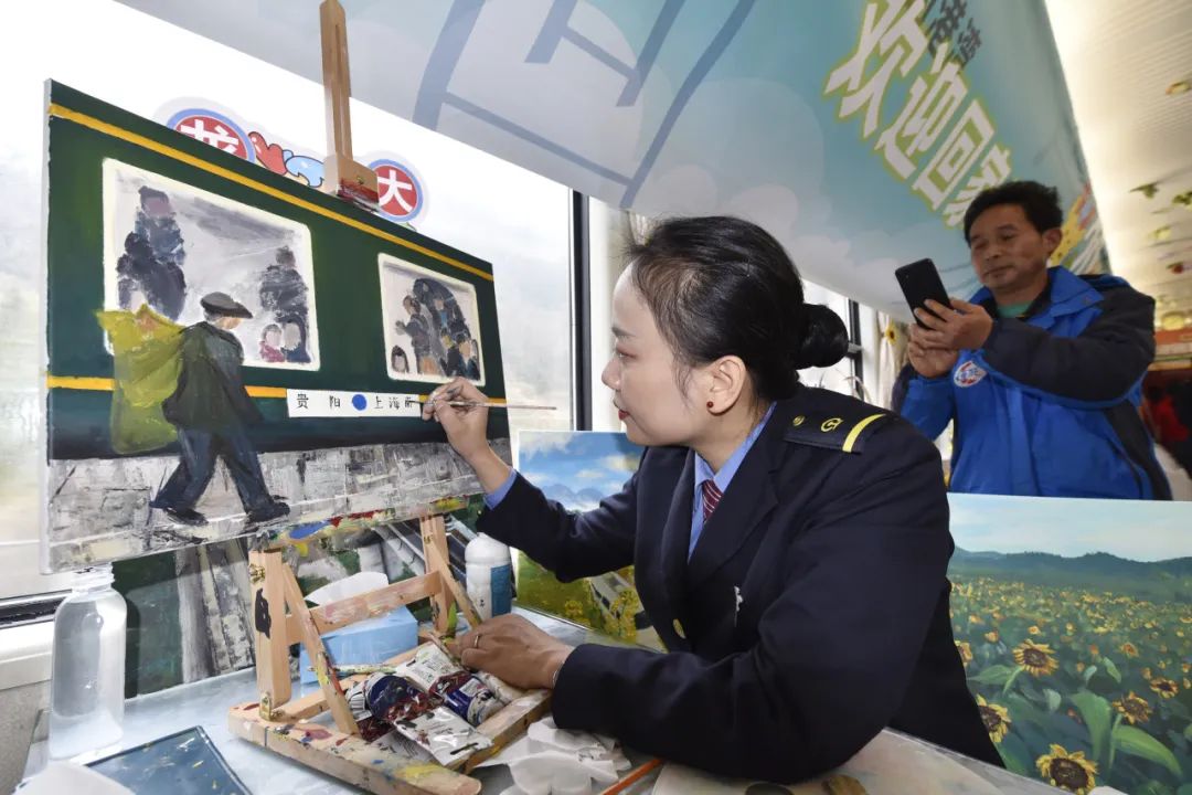 餐车一隅的列车主题丙烯画展上,工作人员周慧将手中的画笔与颜料不停调和,经过多次试色后,再涂到画板进行作画。冬日里和煦的阳光洒落在画作上,一幅幅活灵活现的写实画引得不少旅客驻足围观,打卡拍照。