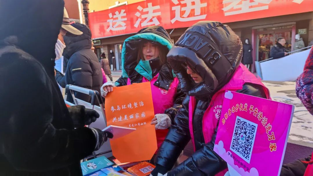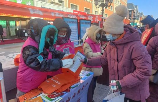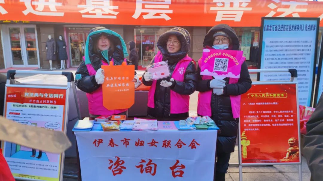在伊美区西步行街,市妇联设立宣传咨询台一处,向妇女群众发放《妇女权益保障法》《反家庭暴力法》《家庭教育促进法》《民法典-婚姻家庭编》及《关爱女童护蕾行动》《平安家庭》《女童防性侵》等与妇女儿童权益息息相关的法律法规和政策宣传资料,引导广大妇女用法律武器维护自身合法权益,培养学习法律知识的良好习惯,为妇女群众送上了一份“新春法治大礼包”。