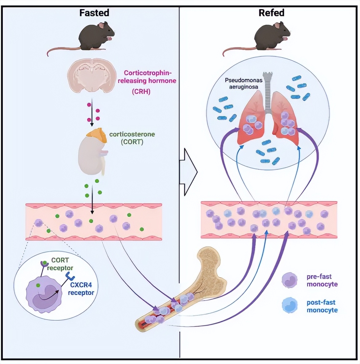 随后,研究人员继续让老鼠禁食24小时,然后重新喂食。隐藏在骨髓中的细胞在几小时内激增回到血液中,导致了炎症水平升高。这些改变后的单核细胞不但不能防止感染,反而更具炎性,使身体对感染的抵抗力下降。①②③