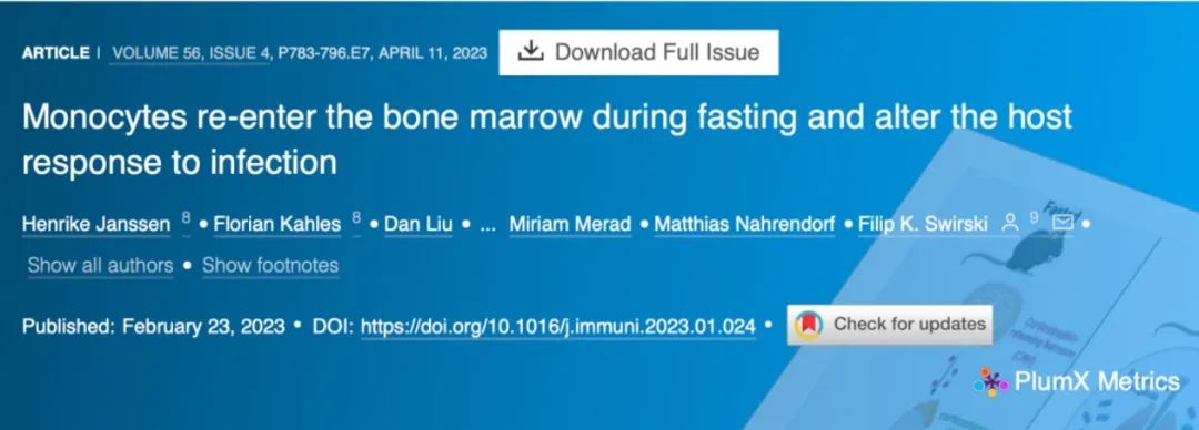 ①Monocytes re-enter the bone marrow during fasting and alter the host response to infection.Immunity.2023.https://doi.org/10.1016/j.immuni.2023.01.024