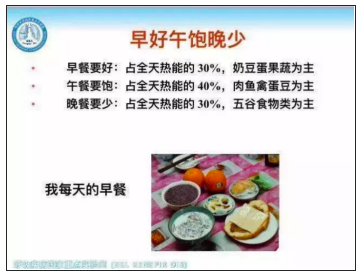 钟南山在现场表示,要遵循“早好午饱晚少”的原则:早餐要吃好,以果蔬豆奶蛋为主,摄入热能占30%;午餐要吃饱,以肉鱼禽蛋豆为主,摄入热能占40%;晚餐要吃少,以杂粮五谷类为主,摄入热能占30%。
