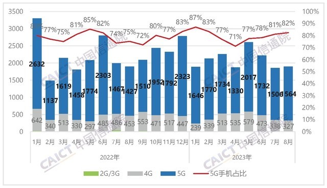 2023年1-8月国内手机市场出货量及5G手机占比,数据来自中国信通院