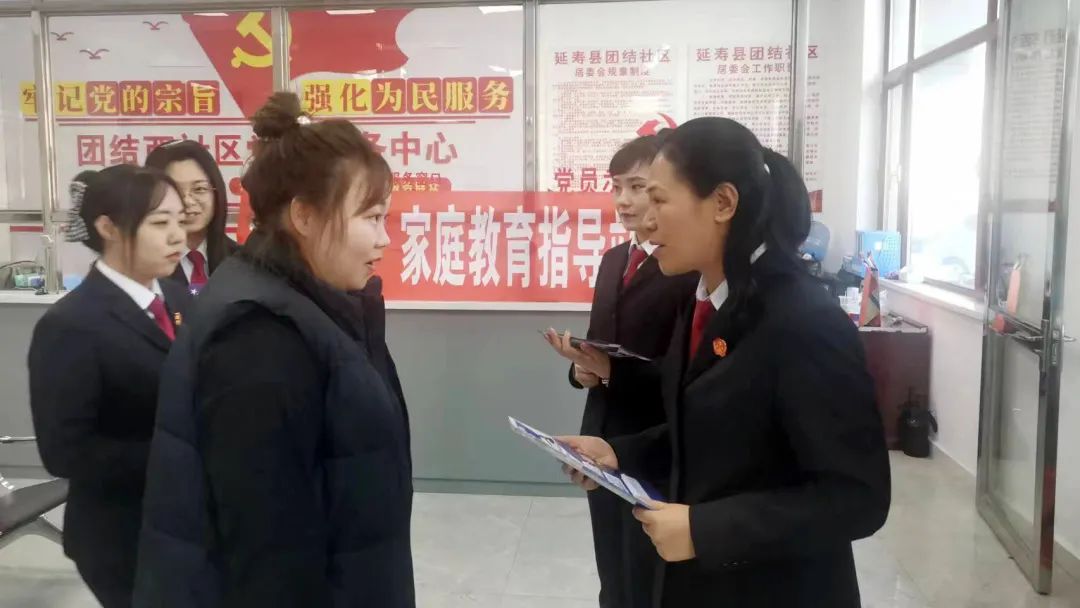 为了有效预防和制止家庭暴力,保护家庭成员的合法权益,维护平等、和睦、文明的家庭关系,1月31日,延寿县人民法院家事法庭携手延寿县团结社区开展以《反家庭暴力法》和《家庭教育促进法》为主题的普法宣传活动。