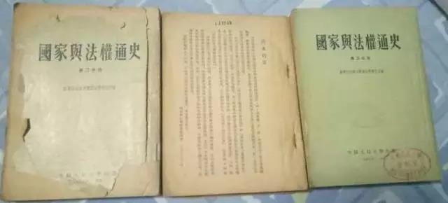 法律系复建了,课程当中就有了外国法制史,我被指定来教授这门课,且当年就要上课。那年8月份我才报到,9月份就开学,根本无法开课,系里就请了林榕年老师来讲课,我也一面备课,一面进修,不断打基础、找资料。就这样坚持到了第二年(1955年),也就能够独立授课了。当时我们用的教科书是苏联的“老三本”,也就是苏联的外国法制史教材,就是这本《国家与法权通史》。(拿出这套教材,展示给访问者,继续说)这套教材学生其实看的不多,就是靠课堂记下笔记,课下再参考世界史的相关内容。当时买书不容易的,教材无法实现人手一册,于是学生要去图书馆借阅。老师也会用钢板刻些讲义,最后发给学生。
