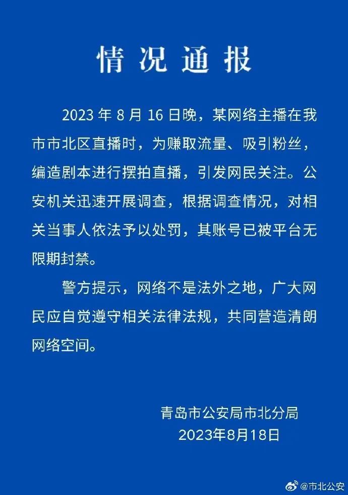 8月18日,青岛市公安局市北分局微博账号“@市北公安”通报称,某网络主播在青岛市市北区直播时,为赚取流量、吸引粉丝,编造剧本进行摆拍直播。公安机关对相关当事人依法予以处罚,其账号已被平台无限期封禁。“#二驴#”“#警方通报网传二驴直播被绑架#”等多个话题阅读量近6.7亿。舆论对此结果表示认同,评论称“山东警方果断调查处置,结果大快人心”。