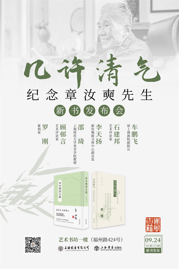 章汝奭(1927-2017),苏州人,学贯中西,译著等身,兼擅诗词古文及书法,并有《晚晴阁诗文集》《晚晴阁诗文续集》等问世。其书法亦在国内外享有盛誉。9月24日,艺术书坊将举办“几许清气——纪念章汝奭先生新书发布会”。活动中,车鹏飞、石建邦、李天扬、邵琦、顾邨言、罗刚等嘉宾,将带来新书《章汝奭诗文集》和《几许清气:章汝奭先生纪念文集》,与读者共同追忆、感悟章太炎先生侄孙,广告学泰斗,诗词、书法名家章汝奭的点滴往事和艺术造诣。
