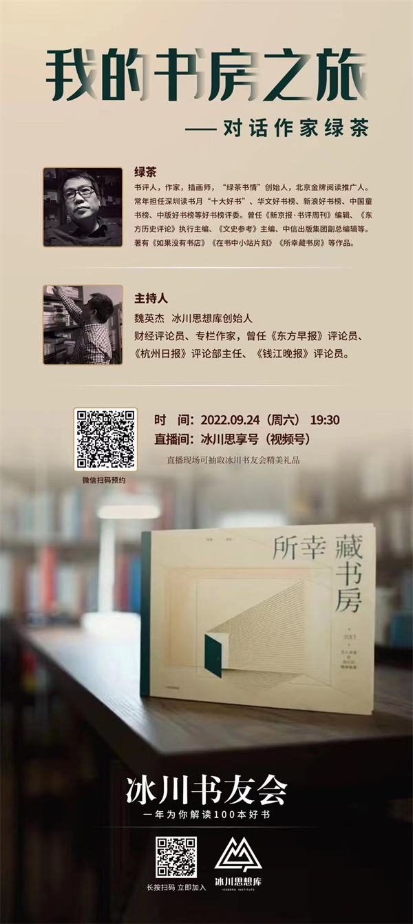 绿茶的《所幸藏书房》终于在全网登陆了。这是他历时三年多“画书房之旅”阶段性作品,共收录120间资深读书人的书房,所以这不单单是他的作品,还是120位书房主人共同参与构成的图文集。本周六,冰川将通过视频号直播的方式,邀请绿茶介绍他所参观过的书房以及他的画作。