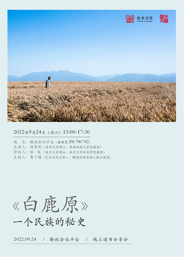 9月24日,群学书院联袂梅园经典共读小组,将以线上讲座的方式,在陕西科技大学杨素秋老师的讲述和南京大学的陆远老师的评议中带领大家进入陈忠实《白鹿原》的文学现场,在特殊的地域文化和社会情境中寻得一份共同的乡愁。