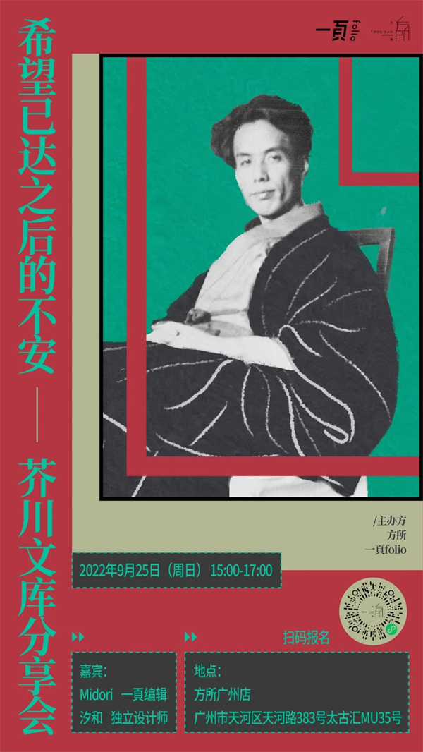 “人生不如一行波德莱尔。”某阿呆、短命鬼才、中二偶像、短篇小说之神、深深悲哀的人,都是他——芥川龙之介。芥川所凝聚的是那个时代的自由精神和怀疑主义。恰逢芥川龙之介诞辰130周年,9月25日,我们邀请一頁芥川文库系列责编Midori、独立设计师汐和到方所广州店,与大家一起聊一聊当下阅读芥川的意义所在以及一頁芥川文库的诞生始末。