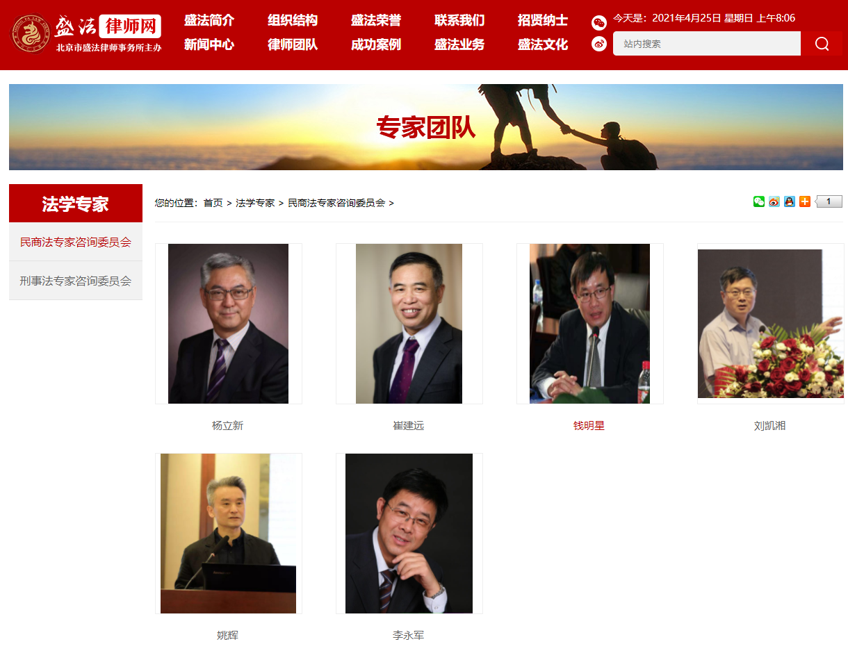 据了解,盛法律师网聘请的民商法专家咨询委员会专家有:杨立新,中国人民大学教授,中国法学会民法学研究会副会长,最高人民检察院专家咨询委员会委员,历任最高人民法院民事审判组长、最高人民检察院民事行政检察厅厅长等职;崔建远,清华大学法学院民法研究中心主任,中国法学会民法学研究会副会长,北京市检察院咨询监督员,最高人民检察院专家咨询委员会委员;钱明星,北京大学法学院教授,中国法学会民法学研究会常务理事,北京市民商法研究会副会长,中国国际经济贸易仲裁委员会仲裁员;刘凯湘,北京大学法学院教授,曾担任中央电视台合同法与经济法专题系列讲座主讲人,2018年7月,最高人民法院民事行政诉讼监督案件专家委员会委员;姚辉,中国人民大学法学院教授,教育部人文社科重点研究基地民商法律科学研究中心执行主任,中国法学会民法学研究会常务理事,中国法学会网络与信息法学研究会副会长,最高人民法院特邀咨询员,曾任最高人民法院民事审判第一庭副庭长等职;李永军,中国政法大学教授,中国法学会民法学研究会副会长,中国政法大学民商经济法学院副院长,北京市政协常委。