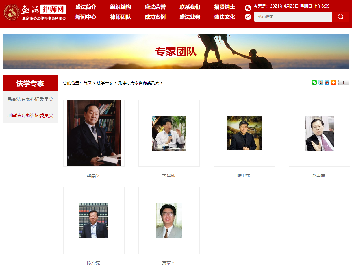盛法律师网聘请的刑事法专家咨询委员会专家有:樊崇义,中国政法大学教授,中国刑事诉讼法学研究会顾问;卞建林,中国政法大学教授,中国刑事诉讼法学研究会会长;陈卫东,中国人民大学法学院教授,中国刑事诉讼法学研究会常务副会长;赵秉志,北京师范大学刑事法律科学研究院教授,中国刑法学研究会会长;陈泽宪,中国社科院法学所教授,中国刑法学研究会常务副会长;黄京平,中国人民大学法学院教授,中国刑法学研究会副会长。