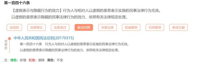 本条是关于虚假表示与隐藏行为效力的规定,《民法通则》与《合同法》未对此进行规定。《民法总则》第146条以对过去的民事法律无效事由的整合、修改为基础,将原《民法通则》《合同法》以“恶意串通损害国家、集体或者第三人利益”“以合法形式掩盖非法目的”为行为无效事由予以修改。本条沿袭了《民法总则》第146条的规定,内容无变化。以下小编就本条相关的法条、裁判规则和司法观点予以整理,供读者更好地理解本条内容。