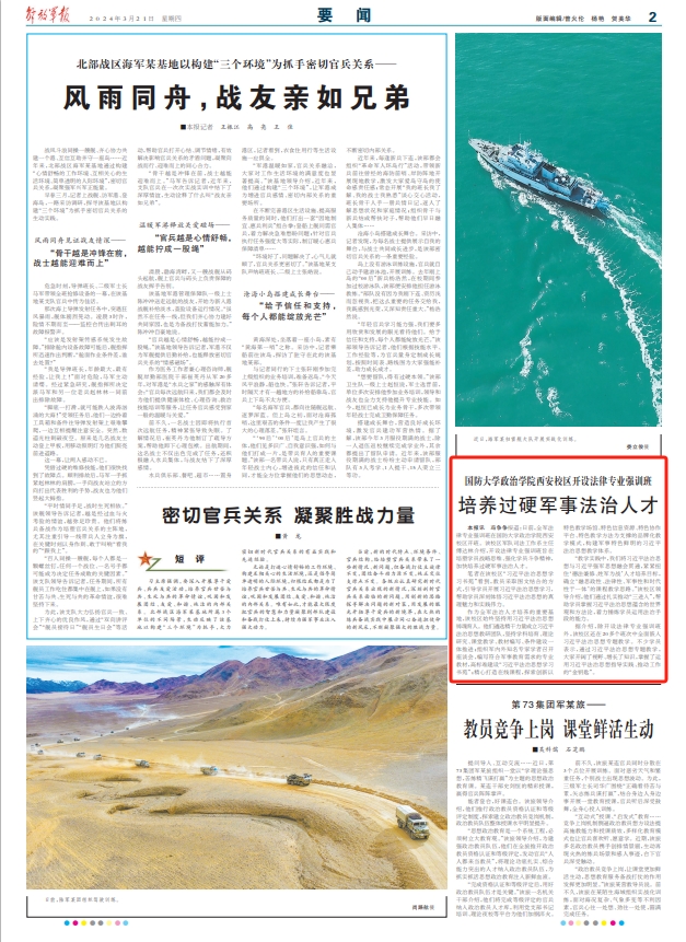 作为全军法治人才培养的重要基地,该校区始终坚持用习近平法治思想铸魂育人。他们遴选精干力量成立习近平法治思想教研团队,坚持学科培育、理论研究、课堂教学、教材编写、条件建设一体推进;组织军内外知名专家学者召开座谈会,编写符合军事教育需求的专业教材,高标准建设“习近平法治思想学习书苑”;精心打造在线课程,探索创新以特色教学场馆、特色信息资源、特色协作平台、特色教学方法为支撑的品牌化教学模式,构建军事特色鲜明的习近平法治思想教学体系。